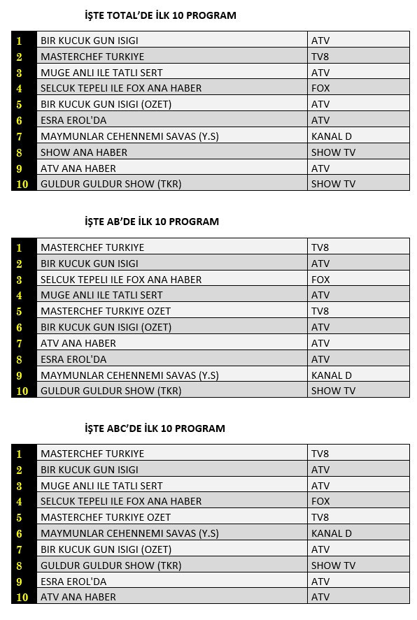 AB'de ise 1. sırada “Masterchef Türkiye”, 2. sırada “Bir Küçük Gün Işığı” 3. sırada “Selçuk Tepeli İle Fox Ana Haber” yer aldı.