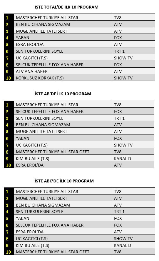 AB'de ise 1.sırada “Masterchef Türkiye All Star”, 2.sırada “Selçuk Tepeli İle Fox Ana Haber”, 3.sırada TRT1’de yayınlanan “Sen Türkülerini Söyle” yer aldı.