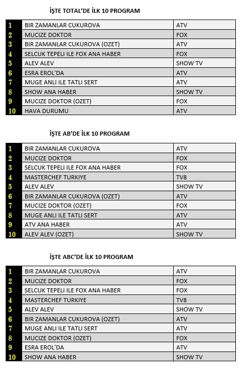 Total'de 1. sırada ATV’de yayınlanan “Bir Zamanlar Çukurova”, 2. sırada FOX TV’de ekrana gelen “Mucize Doktor”, 3. sırada “Bir Zamanlar Çukurova”nın özeti yer aldı.