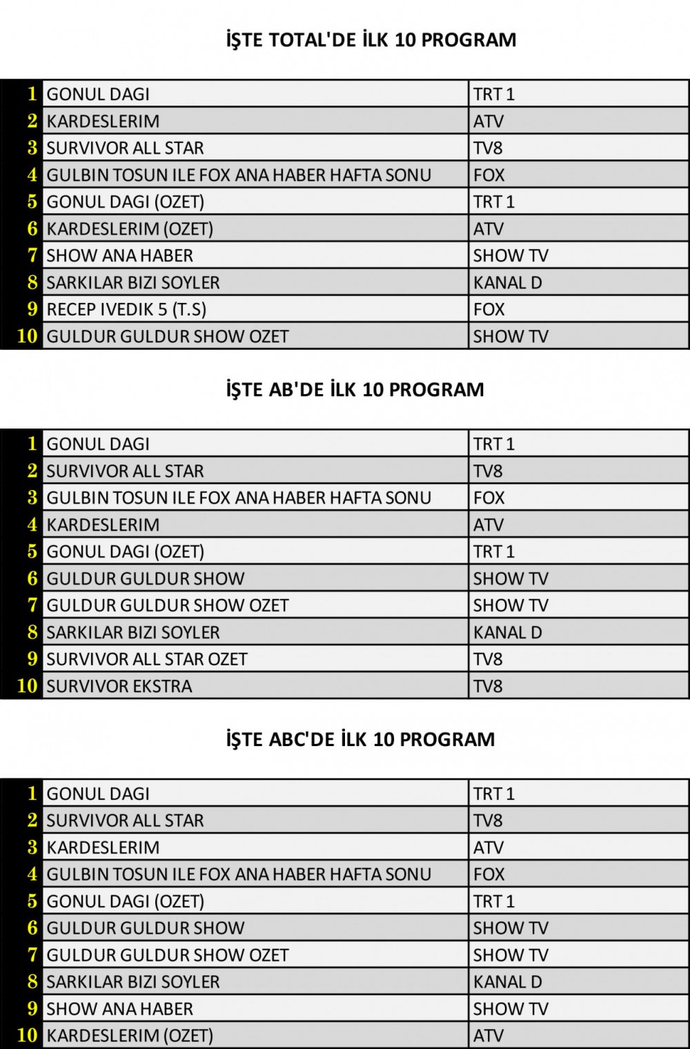 Total’de 1. sırada TRT 1’de izleyici ile buluşan “Gönül Dağı”, 2. sırada ATV’de ekranlara gelen “Kardeşlerim”, 3. sırada ise TV8’de yayınlanan “Survivor All Star”yer aldı.