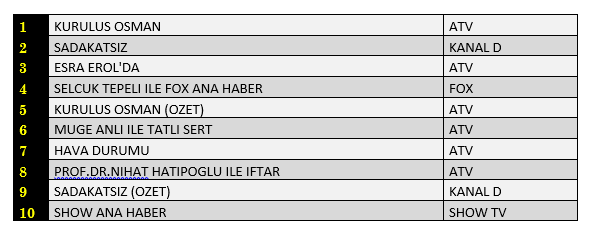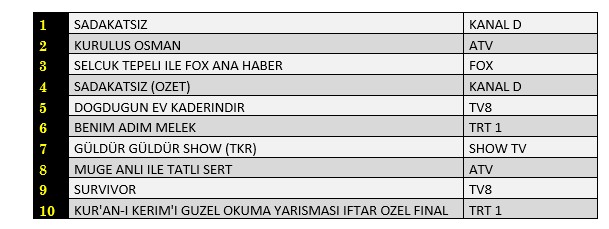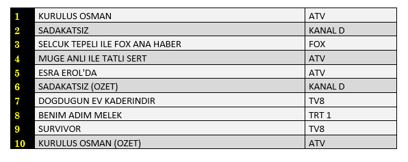 AB'de ise 1.sırada “Sadakatsiz”, 2.sırada“Kuruluş Osman”, 3.sırada “Selçuk Tepeli İle Fox Ana Haber” yer aldı.