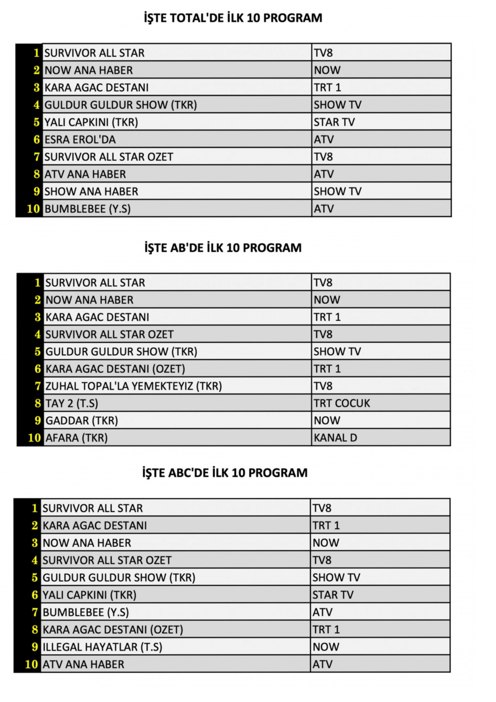 ABC’de 1. sırada “Survivor All Star” , 2. sırada “Kara Ağaç Destanı” ,3. sırada ise “Now Ana Haber” yer aldı.