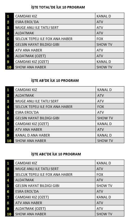 AB'de ise 1.sırada “Camdaki Kız”, 2.sırada ATV’de yayınlanan “Aldatmak”, 3.sırada “Müge Anlı İle Tatlı Sert” yer aldı.