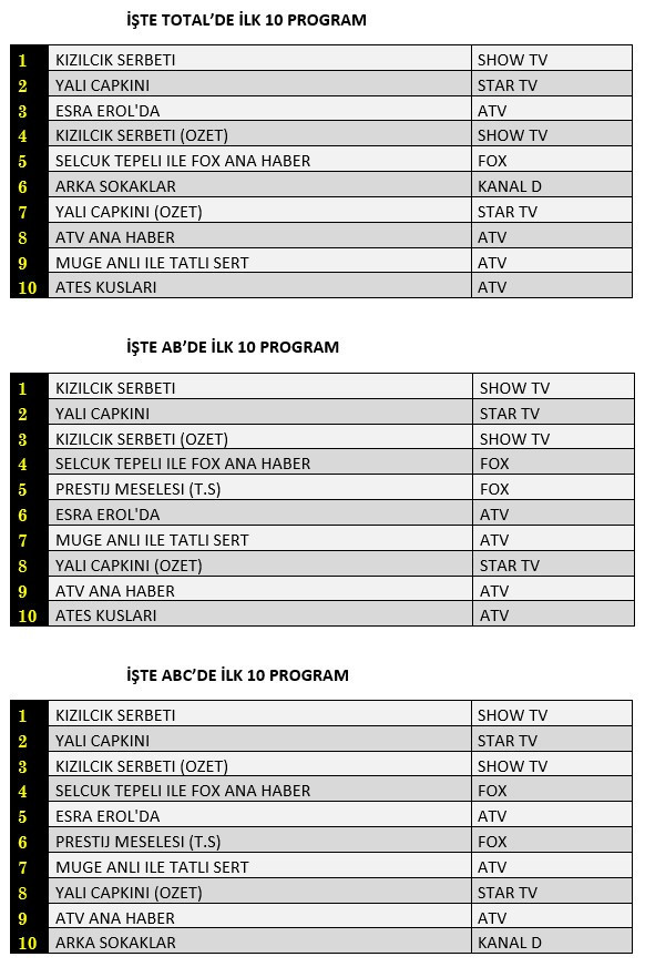 Total'de 1. sırada Show TV’de izleyiciyle buluşan “Kızılcık Şerbeti”, 2. sırada Star TV’de yayınlanan “Yalı Çapkını”, 3. sırada Atv’de ekrana gelen “Esra Erol’da” yer aldı.