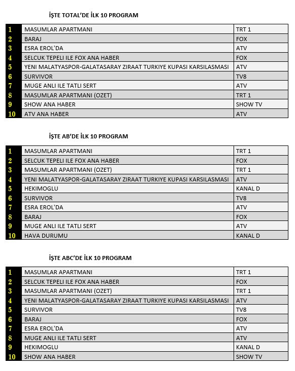 Total'de 1. sırada TRT1’de ekrana gelen “Masumlar Apartmanı”, 2. sırada FOX TV’de yayınlanan “Baraj”, 3. sırada Atv’de izleyiciyle buluşan “Esra Erol'da" programı yer aldı.