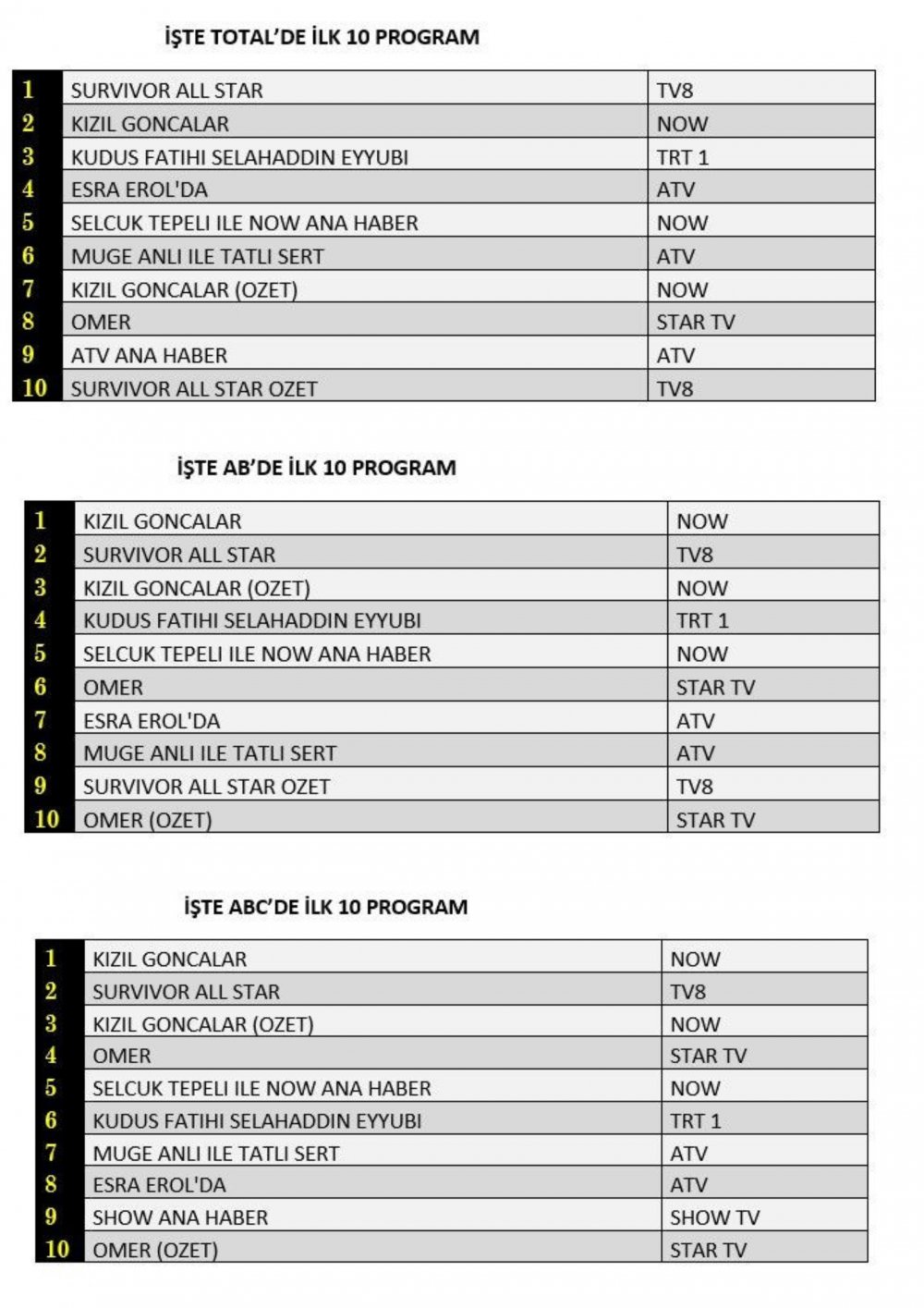 ABC'de ise 1.sırada “Kızıl Goncalar”, 2.sırada “Survivor All Star”, 3.sırada “Kızıl Goncalar” dizisinin özeti yer aldı.