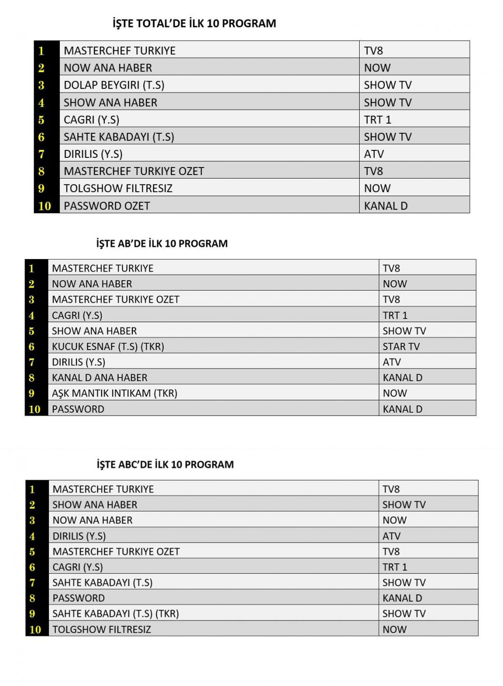 ABC'de ise 1.sırada “Masterchef Türkiye”, 2.sırada “Show Ana Haber”, 3.sırada “Now Ana Haber” yer aldı.