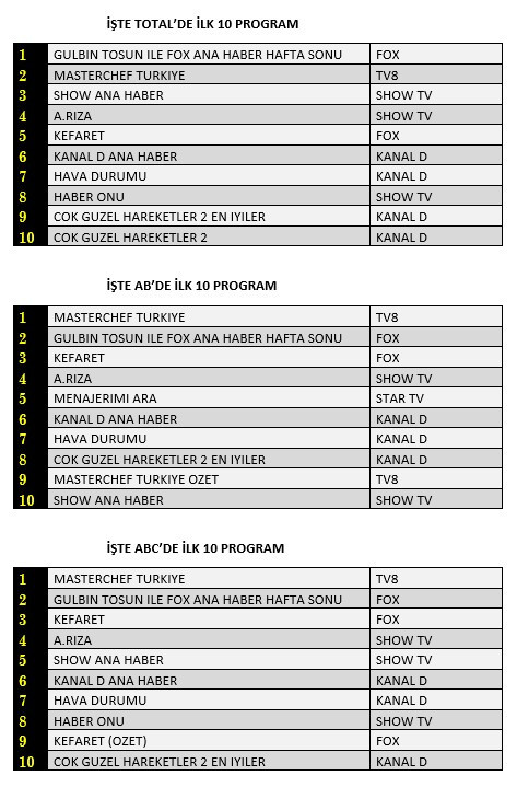 AB'de ise 1. sırada “Masterchef Türkiye”, 2. sırada “Gülbin Tosun İle Fox Ana Haber Hafta Sonu”, 3. sırada Fox TV’de yayınlanan “Kefaret” yer aldı.