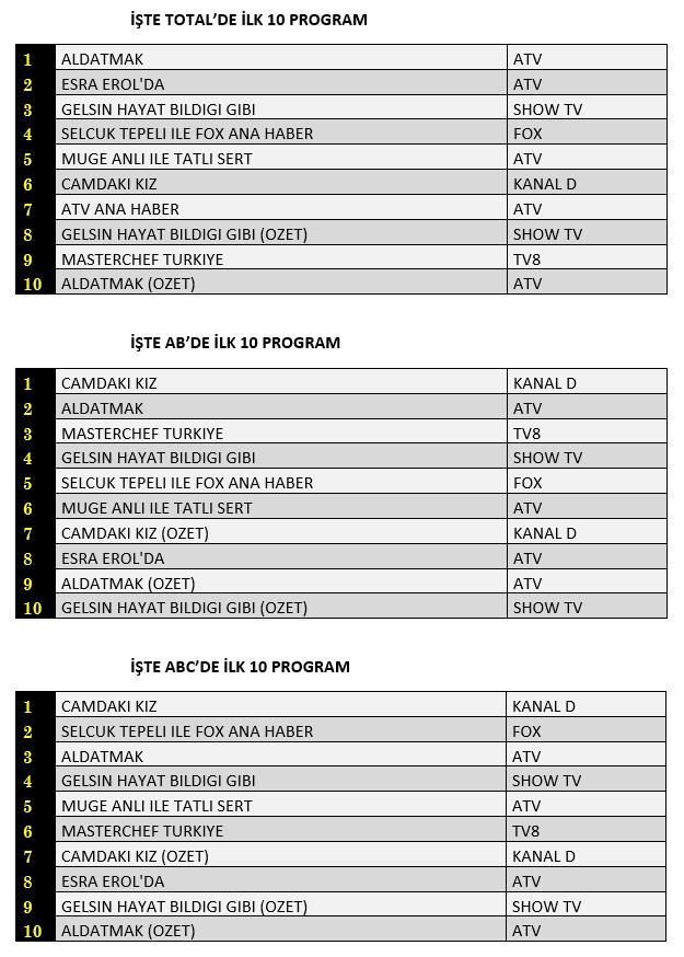 AB'de ise 1.sırada Kanal D’de yayınlanan “Camdaki Kız”, 2.sırada “Aldatmak” 3.sırada Show TV’de ekrana gelen “Masterchef Türkiye” yer aldı.