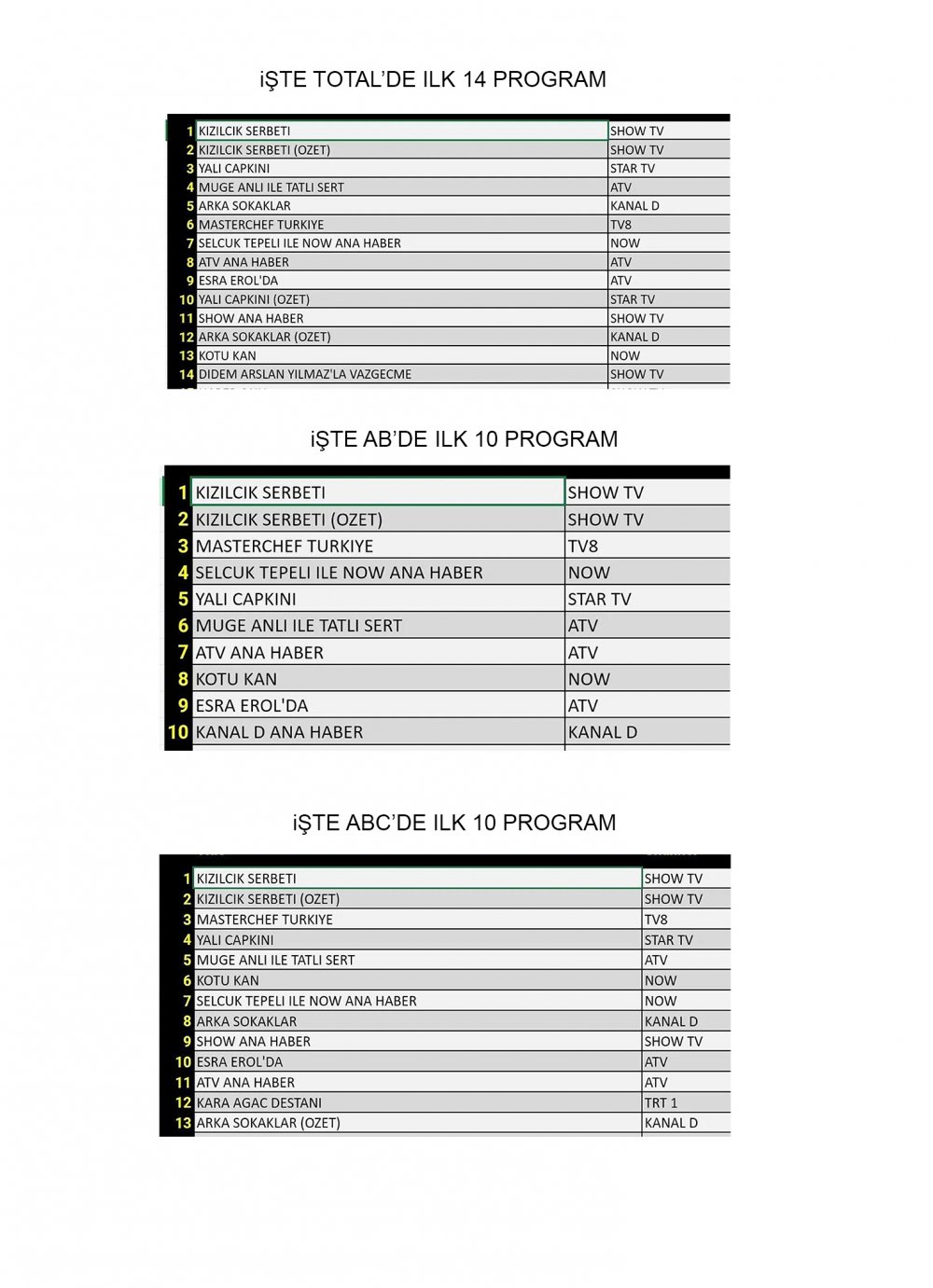 ABC'de ise 1.sırada“Kızılcık Şerbeti”,ikinci sırada “Kızılcık Şerbeti” özet bölümü yer ald”, 3.sırada Tv8'de yayınlanan “Masterchef Türkiye”yer aldı.