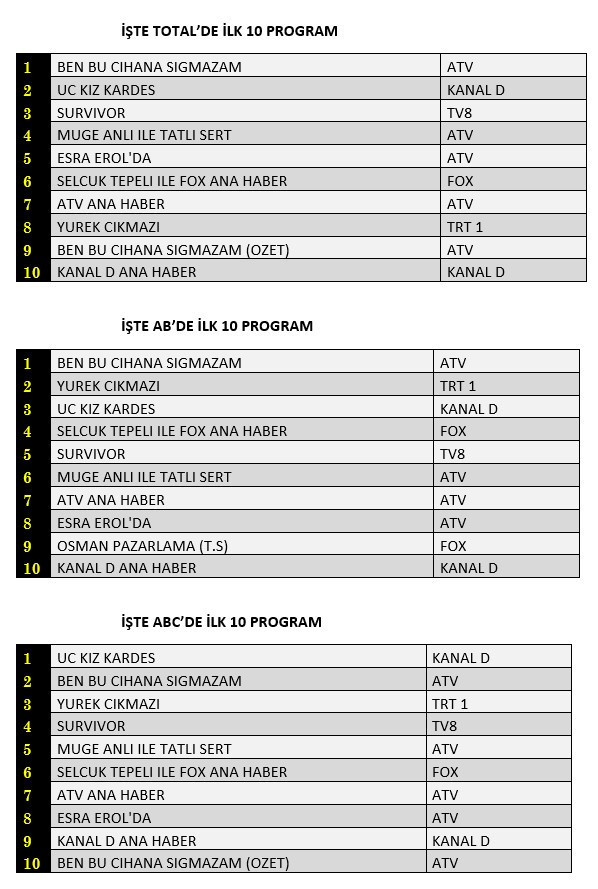 AB'de ise 1. sırada “Ben Bu Cihana Sığmazam”, 2. sırada TRT1’de ekrana gelen “Yürek Çıkmazı”, 3. sırada “Üç Kız Kardeş” yer aldı.