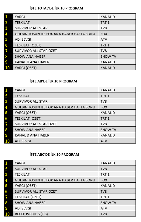 AB'de ise 1. sırada “Yargı”, 2. sırada “Teşkilat” 3. sırada “Survivor All Star” yer aldı.