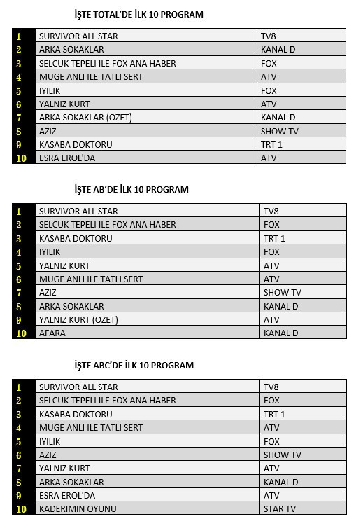 Total'de 1. sırada TV8’de ekrana gelen “Survivor All Star”, 2. sırada Kanal D’de izleyiciyle buluşan “Arka Sokaklar”, 3. sırada “Selçuk Tepeli İle Fox Ana Haber” yer aldı.