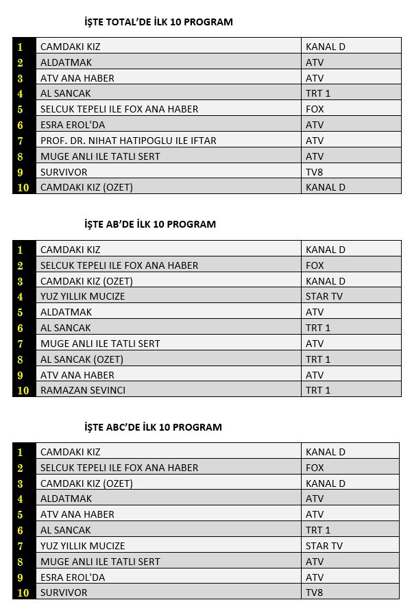 Total'de 1.sırada Kanal D’de izleyiciyle buluşan “Camdaki Kız”, 2. sırada Atv’de yayınlanan “Aldatmak”, 3.sırada “Atv Ana Haber” yer aldı.