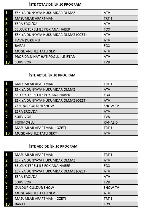 Total'de 1. sırada ATV’de ekrana gelen “Eşkıya Dünyaya Hükümdar Olmaz”, 2. sırada TRT1’de yayınlanan “Masumlar Apartmanı”, 3. sırada ATV’de izleyiciyle buluşan “Esra Erol’da” programı yer aldı.