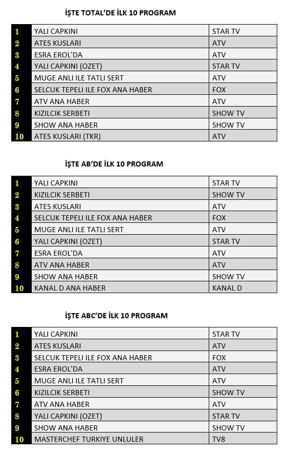 AB'de ise 1.sırada “Yalı Çapkını”, 2.sırada Show TV’de yayınlanan “Kızılcık Şerbeti”, 3.sırada Atv’de ilk bölümü ekrana gelen “Ateş Kuşları” yer aldı.