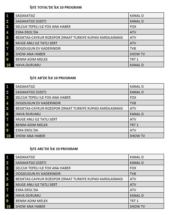 Total'de 1. sırada Kanal D’de ekrana gelen “Sadakatsiz”, 2. sırada “Sadakatsiz” dizisinin özeti, 3. sırada “Selçuk Tepeli İle Fox Ana Haber” yer aldı.