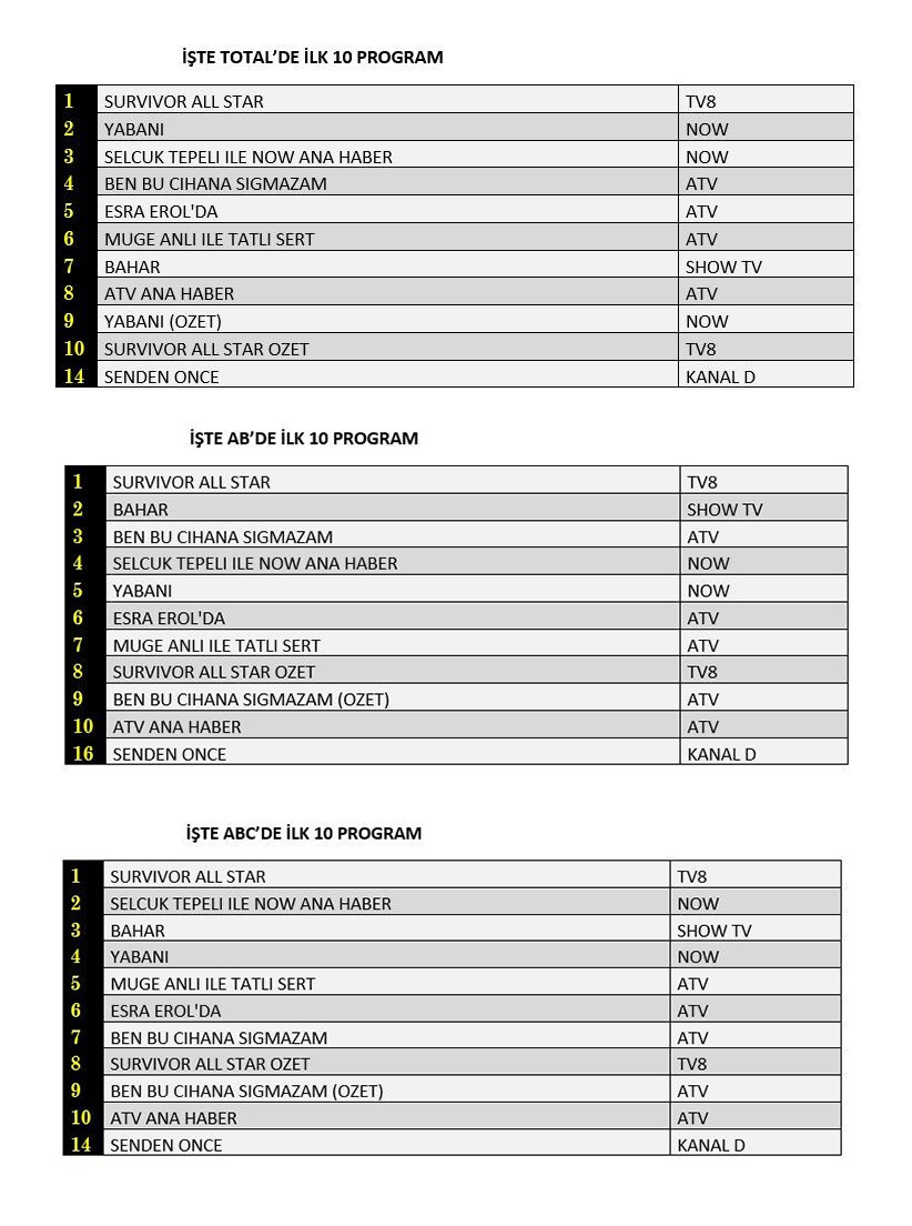 Total'de 1.sırada TV8’de izleyiciyle buluşan “Survivor All Star”, 2. sırada Now TV’de yayınlanan “Yabani”, 3.sırada “Selçuk Tepeli İle Fox Ana Haber”