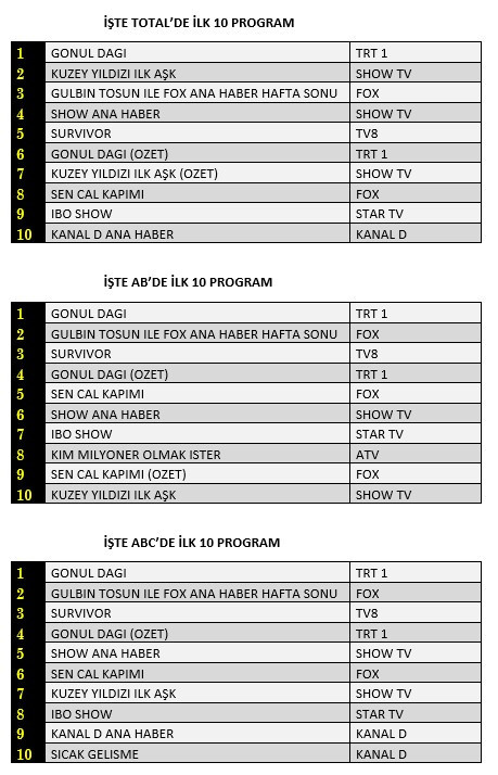 AB'de ise 1. sırada “Gönül Dağı”, 2. sırada “Gülbin Tosun İle Fox Ana Haber Hafta Sonu”, 3. sırada TV8’de yayınlanan “Survivor” yer aldı.