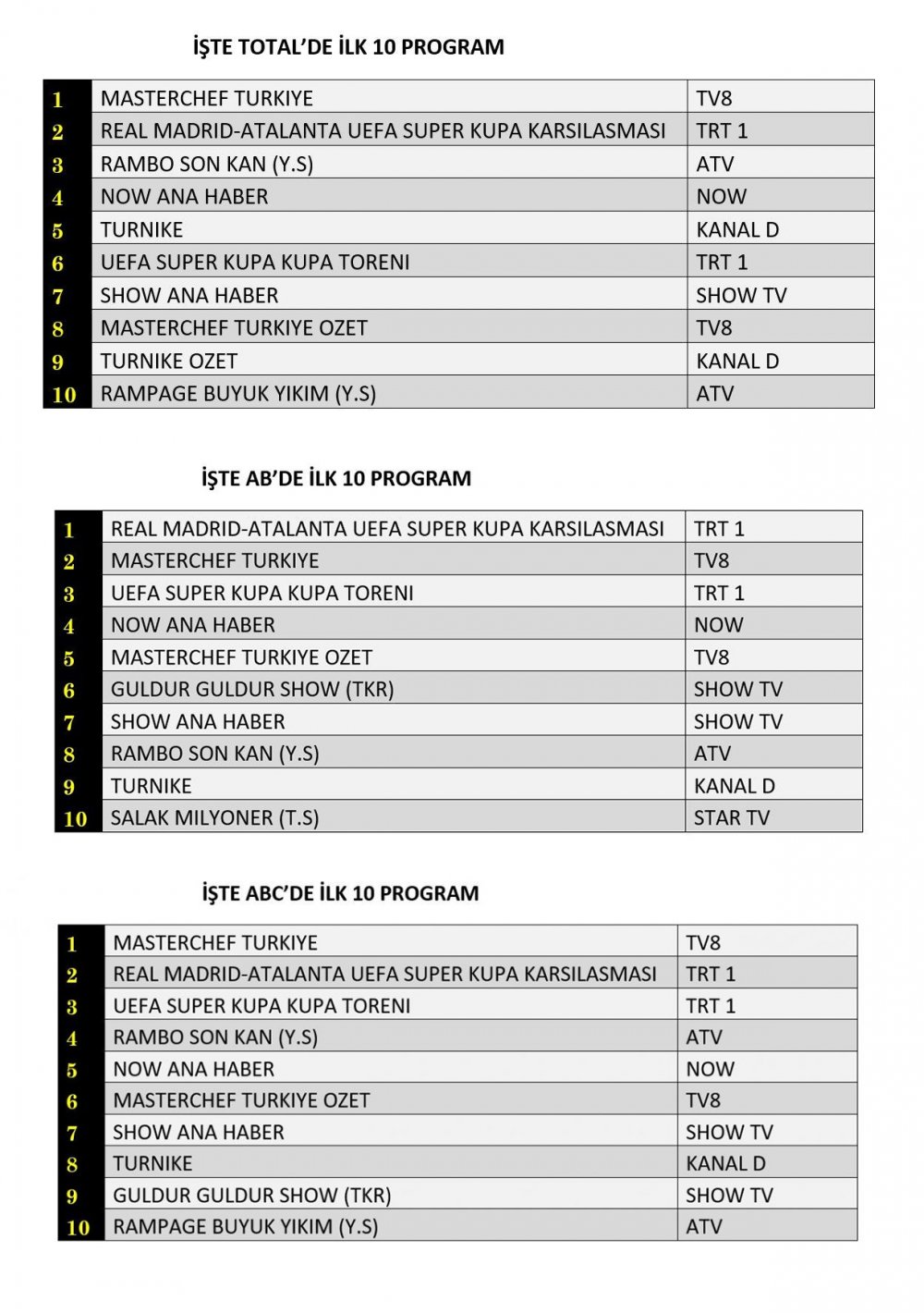 ABC'de ise 1.sırada “Masterchef Türkiye”, 2.sırada “Real Madrid-Atalanta UEFA Süper Kupa Karşılaşması”, 3.sırada “UEFA Süper Kupa Töreni” yer aldı.