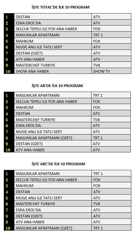 AB'de ise 1. sırada TRT1’de yayınlanan “Masumlar Apartmanı”, 2. sırada “Selçuk Tepeli İle Fox Ana Haber” 3. sırada Fox TV’de ilk bölümü ekrana gelen “Mahkum” dizisi yer aldı.