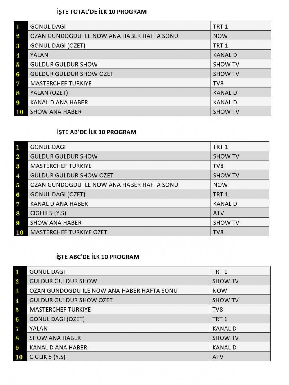 ABC'de 1.sırada “Gönül Dağı”, 2.sırada Show TV’de yayınlanan “Güldür Güldür Show”, 3.sırada TV8’de ekrana gelen “Masterchef Türkiye” yer aldı.