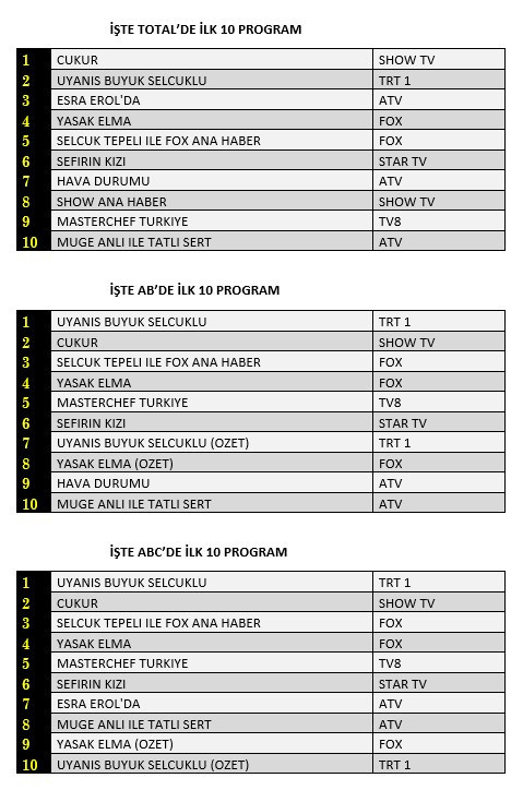 Total'de 1. sırada Show TV’de yayınlanan “Çukur”, 2. sırada TRT1’de ekrana gelen “Uyanış Büyük Selçuklu”, 3. sırada ATV’de izleyiciyle buluşan “Esra Erol’da” programı yer aldı.