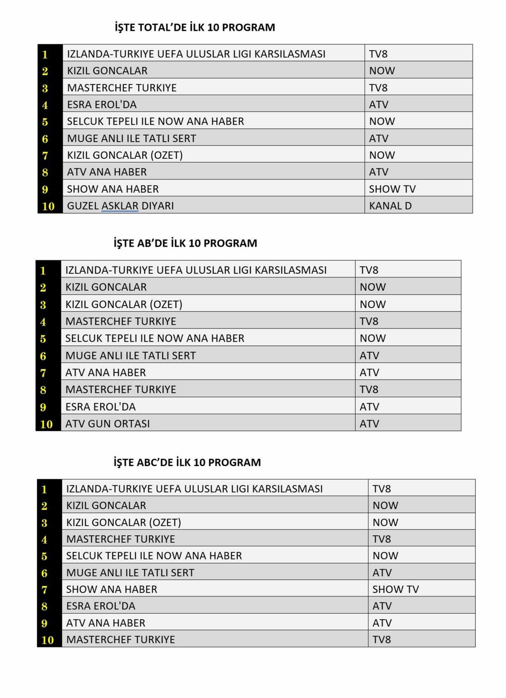 ABC grubunda da zirvede "İzlanda-Türkiye UEFA Uluslar Ligi Karşılaşması" yer aldı. 2. sırayı "Kızıl Goncalar" dizisi alırken, 3. sırada "Kızıl Goncalar" dizisinin özeti yer aldı.