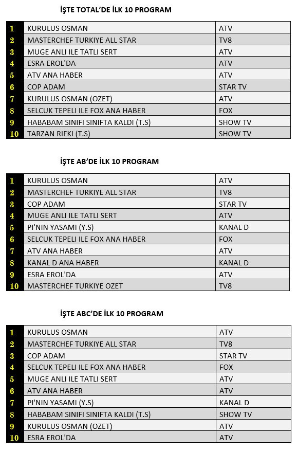 AB'de ise 1.sırada “Kuruluş Osman”, 2.sırada “Masterchef Türkiye All Star”, 3.sırada Star TV’de yayınlanan “Çöp Adam” yer aldı.