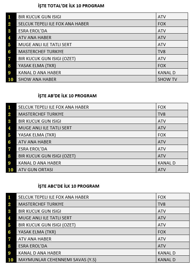 Total'de 1. sırada Atv’de izleyiciyle buluşan “Küçük Bir Gün Işığı”, 2. sırada “Selçuk Tepeli İle Fox Ana Haber”, 3. sırada Atv’de yayınlanan “Esra Erol’da” yer aldı.
