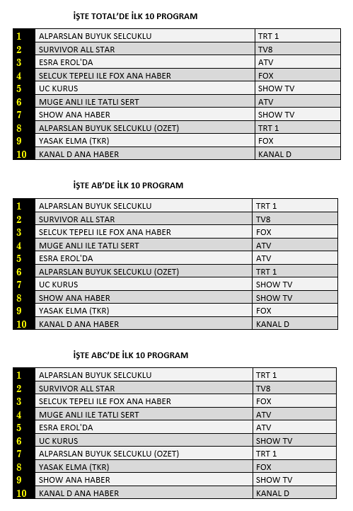 AB'de ise 1. sırada “Alparslan Büyük Selçuklu”, 2. sırada “Survivor All Star” 3. sırada “Selçuk Tepeli İle Fox Ana Haber” yer aldı.