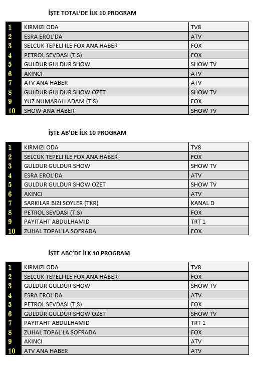 Total'de 1. sırada TV8’de ekrana gelen “Kırmızı Oda”, 2. sırada ATV’de izleyiciyle buluşan “Esra Erol’da” programı, 3. sırada “Selçuk Tepeli İle Fox Ana Haber” yer aldı.