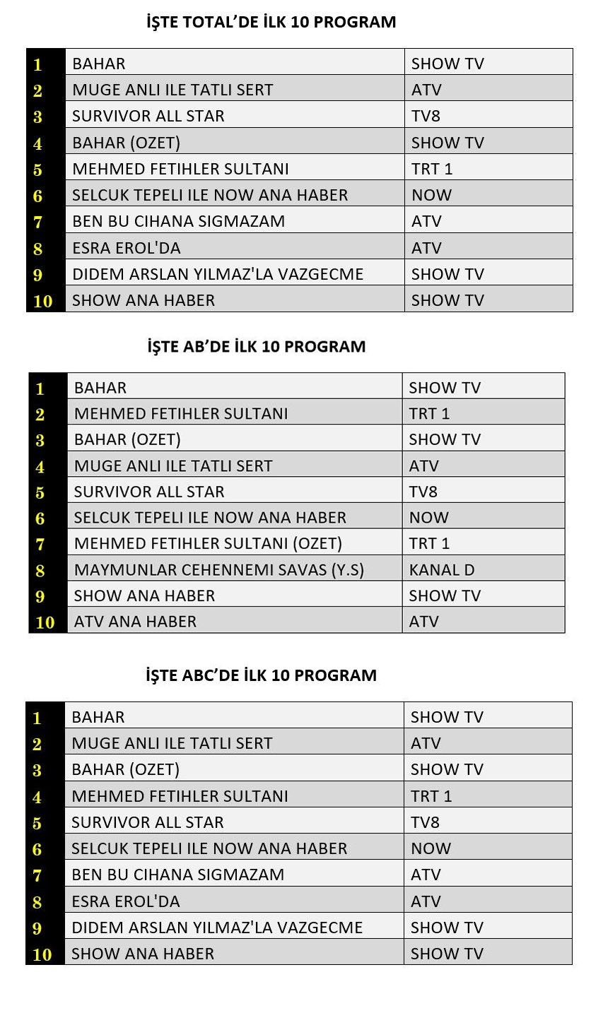 Total'de 1.sırada Show TV’de izleyiciyle buluşan “Bahar”, 2. sırada Atv’de ekrana gelen “Müge Anlı İle Tatlı Sert”, 3.sırada TV8’de yayınlanan “Survivor All Star” yer aldı.