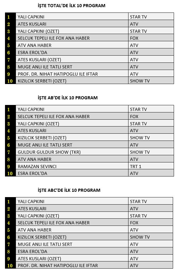 Total'de 1.sırada Star TV’de izleyiciyle buluşan “Yalı Çapkını”, 2. sırada ATV’de yayınlanan “Ateş Kuşları”, 3.sırada Show TV’de ekrana gelen “Kızılcık Şerbeti” dizisinin özeti yer aldı.
