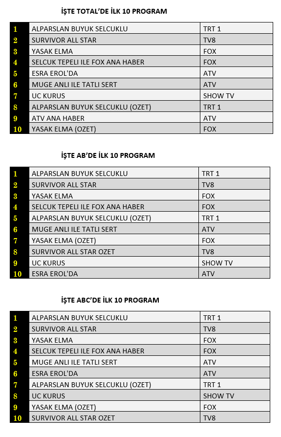 AB'de ise 1.sırada “Alparslan Büyük Selçuklu”, 2.sırada “Survivor All Star” 3.sırada “Yasak Elma” yer aldı.