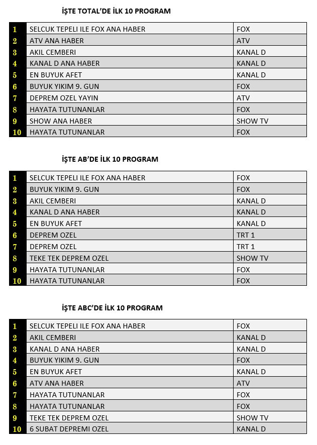 AB'de ise 1.sırada “Selçuk Tepeli İle Fox Ana Haber”, 2.sırada Fox TV’de yayınlanan “Büyük Yıkım 9. Gün”, 3.sırada “Akıl Çemberi” yer aldı.