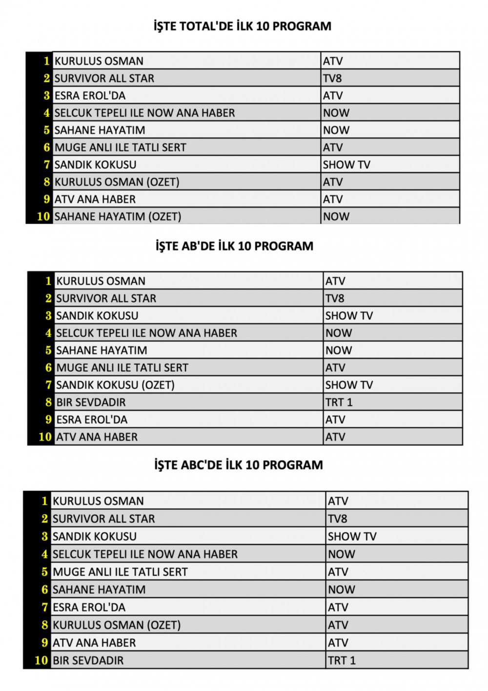 ABC’de 1. sırada “Kuruluş Osman” , 2. sırada “Survivor All Star”, 3. sırada ise “Sandık Kokusu” yer aldı.