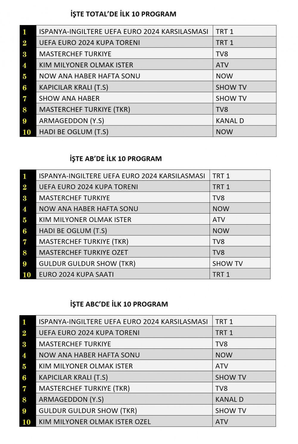 ABC'de ise 1.sırada “İspanya-İngiltere UEFA Euro 2024 Karşılaşması”, 2.sırada “UEFA Euro 2024 Kupa Töreni”, 3.sırada “Masterchef Türkiye” yer aldı.
