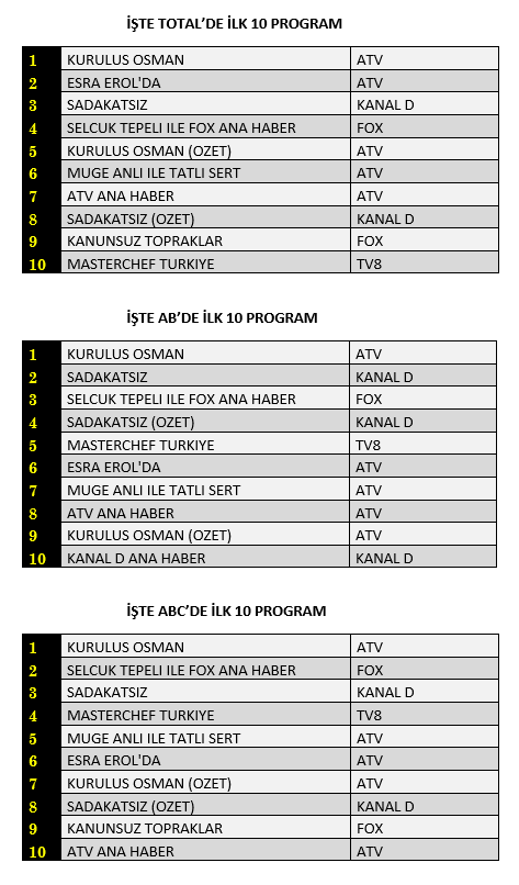 AB'de ise 1. sırada “Kurtuluş Osman”, 2. sırada “Sadakatsiz” 3. sırada “Selçuk Tepeli İle Fox Ana Haber” yer aldı.