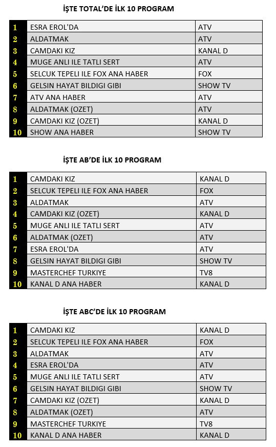 Total'de 1. sırada atv’de izleyiciyle buluşan “Esra Erol’da”, 2. sırada atv’de ekrana gelen “Aldatmak”, 3. sırada Kanal D’de yayınlanan “Camdaki Kız” yer aldı.