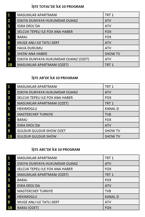 Total'de 1. sırada TRT1’de yayınlanan “Masumlar Apartmanı”, 2. sırada ATV’de ekrana gelen “Eşkıya Dünyaya Hükümdar Olmaz”, 3. sırada ATV’de izleyiciyle buluşan “Esra Erol’da” programı yer aldı.