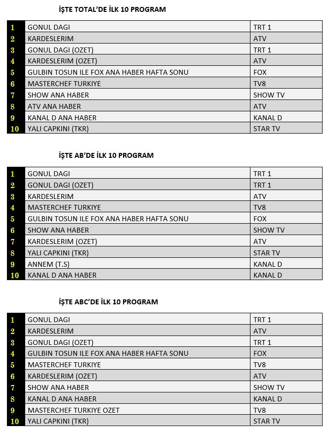 Total'de 1.sırada TRT1’de izleyiciyle buluşan “Gönül Dağı”, 2. sırada Atv’de ekrana gelen “Kardeşlerim”, 3.sırada “Gönül Dağı” dizisinin özeti yer aldı.