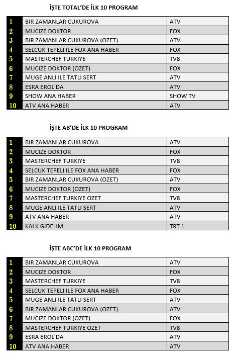 Total'de 1. sırada ATV’de yayınlanan “Bir Zamanlar Çukurova”, 2. sırada Fox TV’de ekrana gelen “Mucize Doktor”, 3. sırada “Bir Zamanlar Çukurova”nın özeti yer aldı.