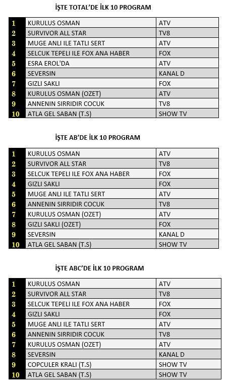 AB'de ise 1. sırada “Kuruluş Osman”, 2. sırada “Survivor All Star” 3. sırada “Selçuk Tepeli İle Fox Ana Haber” yer aldı.