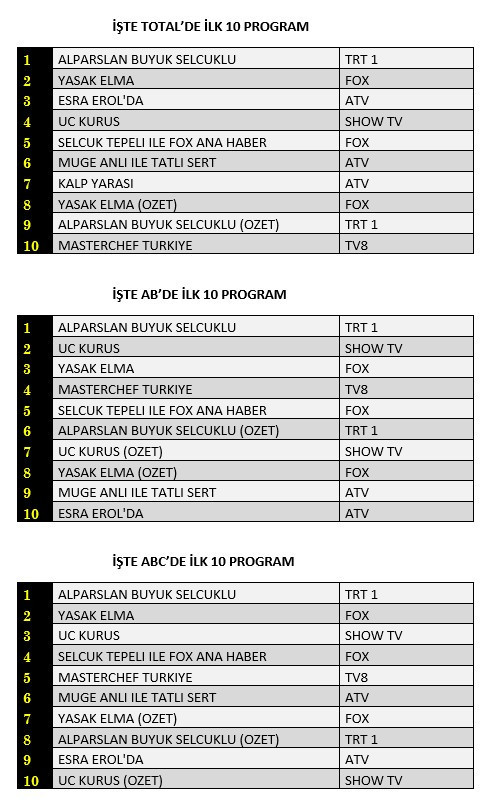 AB'de ise 1. sırada “Alparslan Büyük Selçuklu”, 2. sırada Show TV’de yayınlanan “Üç Kuruş” 3. sırada “Yasak Elma” yer aldı.