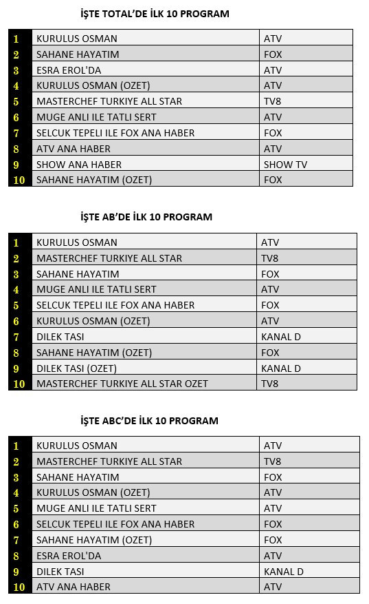 Total'de 1.sırada Atv’de izleyiciyle buluşan “Kuruluş Osman”, 2. sırada Fox TV’de yayınlanan “Şahane Hayatım”, 3.sırada Atv’de ekrana gelen “Esra Erol’da” yer aldı.