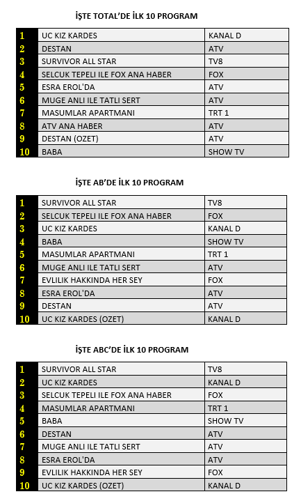 Total'de 1. sırada Kanal D’de yayınlanan “Üç Kız Kardeş” 2. sırada Atv’de ekrana gelen “Destan”, 3. sırada TV8’de izleyiciyle buluşan “Survivor All Star” yer aldı.