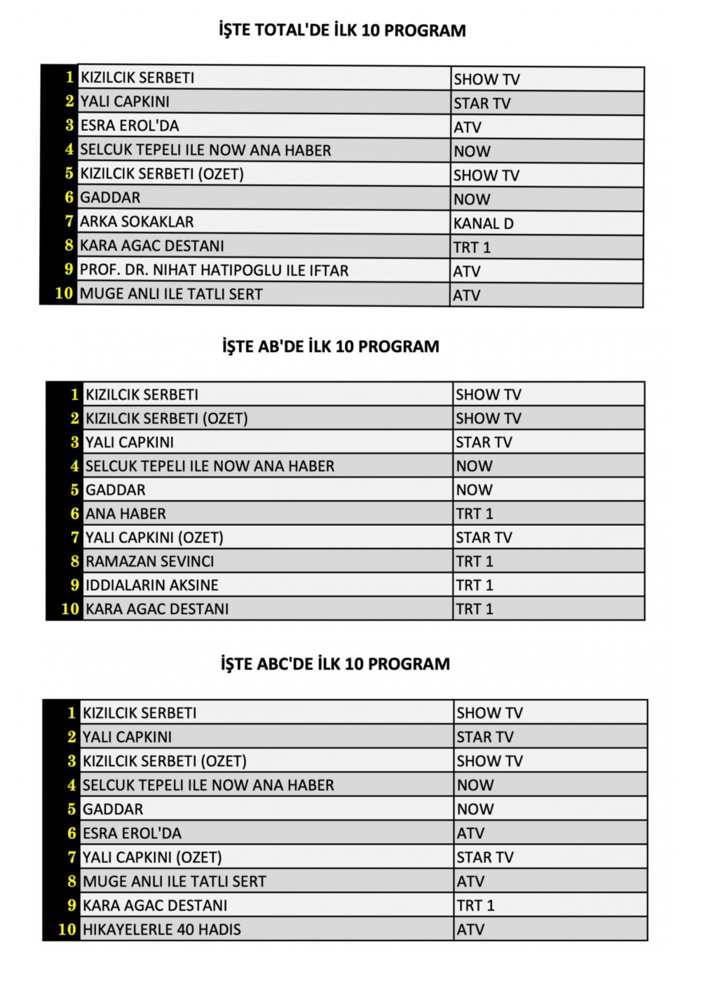 ABC’de 1. sırada “Kızılcık Şerbeti” ,2. sırada “Yalı Çapkını”, 3. sırada ise “Kızılcık Şerbeti” özet bölümü yer aldı.