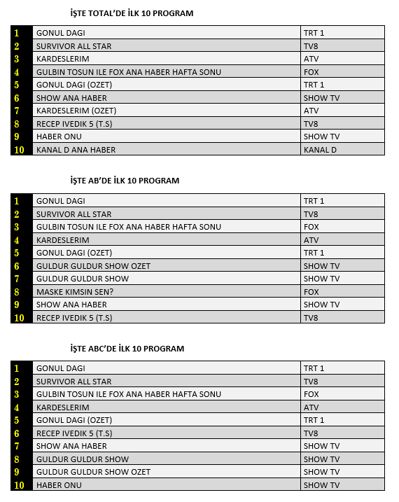AB'de ise 1. sırada “Gönül Dağı”, 2. sırada “Survivor All Star” 3. sırada “Gülbin Tosun İle Fox Ana Haber Hafta Sonu” yer aldı.