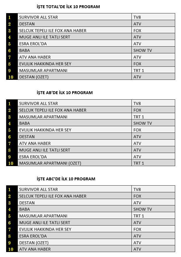 Total'de 1. sırada TV8’de yayınlanan “Survivor All Star” 2. sırada ATV’de ekrana gelen “Destan”, 3. sırada “Selçuk Tepeli İle Fox Ana Haber” yer aldı.